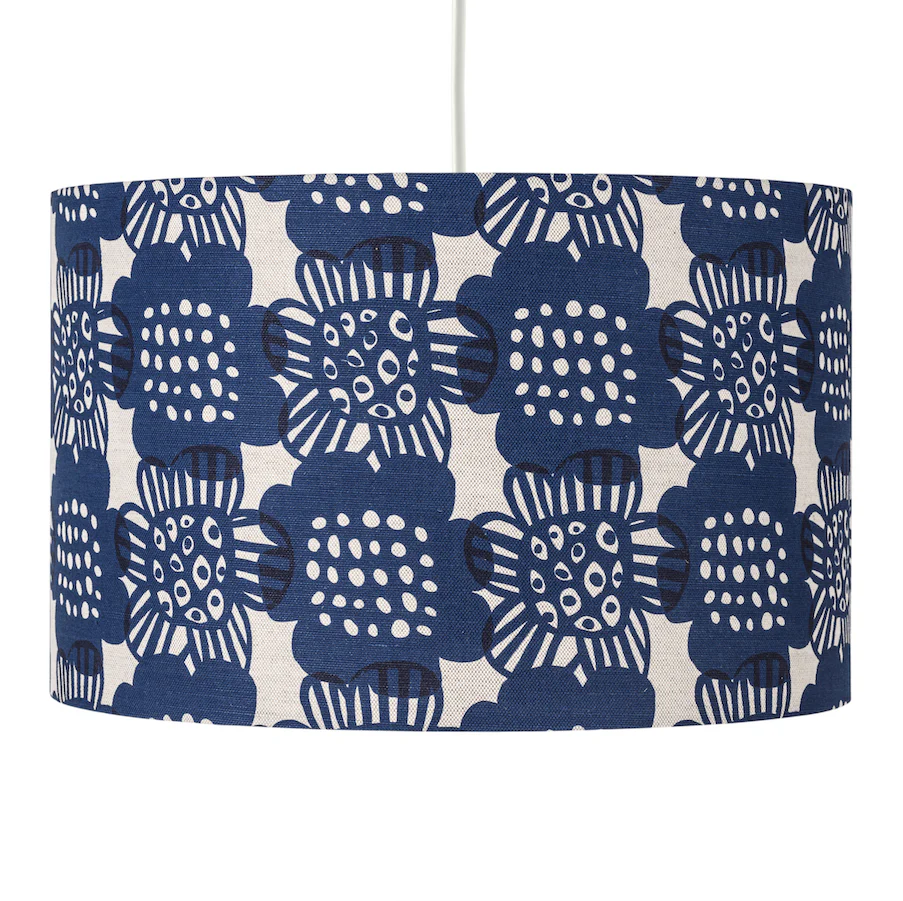 Bloom is our brand new fabric designed by Lisa Baudry and comes in 4 gorgeous colours you are sure to love. The fabric is a hopsack linen printed in the UK. This lampshade is made by us and can be used for a hanging pendant lamp or to sit on a lamp base.